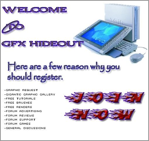 | Welcome to GFX Hideout. .-~*´¨¯¨`*·~-. Your #1 source for graphics!. We hope you enjoy your visit. You're currently viewing our forum as a guest. This means you are limited to certain areas of the board and there are some features you can't use. If you join our community, you'll be able to access member-only sections, and use many member-only features such as customizing your profile, sending personal messages, and voting in polls. Registration is simple, fast, and completely free. Join our community! If you're already a member please log in to your account to access all of our features: |