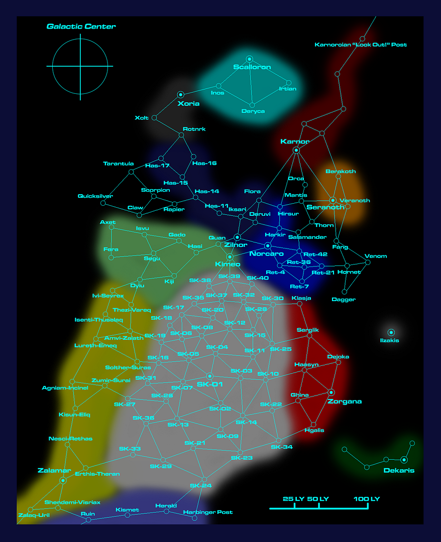 So I have this insanely well-developed science fiction setting that I'd really love to RP in. Unfortunately, I have been unable to start said RP. The setting is somewhat integrated into the science fiction setting on Reality's Exile, but due to that integration, several key elements are missing. All will become clear as I explain it, though. We'll start with a basic setting outline. http://i31.photobucket.com/albums/c366/Sco...arlingMapV3.png Here we have ye olde mappe of Known Space. It is color-coded depending on the nation owning the area. Each circle is a system. There is nothing in-between the systems except empty space and stars without planets, with almost no exception. The lines represent connections made by jump gates. Let me explain the different nations in no particular order. The dark blue ones are Garlings. Their physical description can be found here. Garlings are the first of the three most politically powerful species in Known Space. They really love plasma and plasma-related weaponry and stuff powered by plasma, although they do also enjoy using ion beam cannons. They have a fairly strong military influence, although they are reluctant to enter wars unless they are directly threatened. The blue ones are Norcaroians. Their description can be found here. Norcaroians are the second of the three most politically powerful species in Known Space. They use weaponry which looks a lot like lasers, but is actually a type of particle cannon. These are dubbed "lascannons" (yes, I know, Warhammer 40K). They generally go to war when provoked. They are also my brother's species, so I can't answer questions about these people so much. The sort of light green ones are Kimeans. Their description can be found here. Kimeans are the third of the three most politically powerful species in Known Space. They use neutron cannons, but since they're pretty much pacifists, it's unlikely that you'll ever see one fired. They never fight unless they are directly threatened very consistently, and even then, they mostly hire escorts. They have the largest amount of corporations in Known Space, and they pretty much have a monopoly over all the major trade that goes on. The above three species make up the alliance known as GNK, which is the second-biggest government in Known Space. The white ones are the Sar Kerith. Their description can be found here. The Sar Kerith are the biggest species (a whopping 25 billion), and they possess the most systems. However, their government is pretty disjointed and loose. Each system has its own government, and while the whole species acts as one nation, this is only represented by each system having to send one representative to the Sar Kerith Ruling Council. Otherwise, the different systems pretty much mind their own business unless a cooperative effort from the nation is required. The Sar Kerith probably have the most primitive technology in Known Space. They use weapons like rail guns, coil guns and chain guns. Their shields are also the most primitive, along with their hyperdrives, but they make up for this with heavy armor on their ships. The Sar Kerith are devoted to neutrality, so they welcome everybody into their borders, no matter what species they are. They do, however, have a blacklist, so anybody who stirs up trouble will probably find themselves being forcibly removed from Sar Kerith space. The red ones are the Zorga. Their description can be found here. The Zorga are a very strange species. They are pretty paranoid, so until they figure that somebody's not out to get them, they are hostile to them, unless something about them perks their interest. They really love their bio-technological experiments, so much that no one member of the species can really say for sure whether or not their DNA is identical to the original DNA of the Zorga. Their technology is mostly quite odd, to say the least. Their basic weapons of choice are energy-infused autocannons and gauss weapons, but they also have such strange weapons as flechette cannons, suicide craft, and giant, hollow drills that expose an unshielded ship to the vacuum of space. The Zorga are very hostile, and do not hesitate to start wars if they feel it is necessary (and believe me, they feel a lot). The dark grey ones are Xorian Raiders. Their description can be found here. The Xorians are one of the newest species in Known Space. They are indeed a hive mind, but it is quite loose, so they are free to do whatever they like, unless they are given a direct order by the hive mind, in which case they are pretty much screwed. Xorians use particle cannons and fusion pulse cannons quite exclusively. Xorians raid Kimean convoys on a day-to-day basis, and any other traders they come across. Needless to say, the Has border worlds are a very dangerous place to be. The orange ones are Hogrogs. Their description can be found here. Once again, this species was made by my brother, so I don't know too much about them. They have a lot of scavenged technology from both the Norcaroians and Zorga, though. Think of them as like the Xorian Raiders of eastern Known Space. The blank ones are Pirate Gathering Posts. The link to them can be found here. The Hogrogs, Zorga and Xorian Raiders chill there. The dark green ones, the dark red ones and the grey one are the Dekari, Karnoroians and Tzaru-Sokinu. They're not really fully integrated into Known Space yet, so we won't worry about them. The sort of yellowish ones are the Zalamath. Their description can be found here. These ones were made by my good friend Pieboy, but I can still answer some general questions about them. On the ground they use a liquid known as gaisa-samvar for weaponry, which is highly corrosive and increases in surface tension under pressure, so it's normally put in a state where it can pierce skin. However, for their space ships, they use stuff like rail guns, machine guns and lasers. I'm not sure exactly how their foreign policy works, but they're fairly xenophob